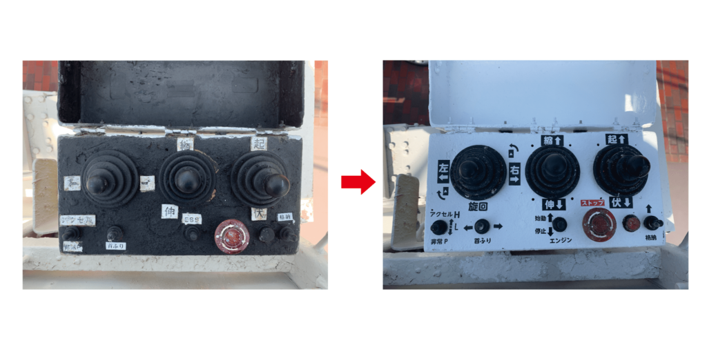 2023年5月17日 / Last updated : 2023年5月19日 axt 高所作業車 上部操作盤リニューアル 使い込まれて見え難くなっていた操作盤の文字をリニューアルしました。 右に倒すと「左旋回」、左に倒すと「右旋回」 旋回部分ですが、動きが逆になるので上に上がると混乱してしまいます。 Leave a Reply Cancel replyYour email address will not be published. Required fields are marked *Comment * Name * Email * Website Save my name, email, and website in this browser for the next time I comment. Δ